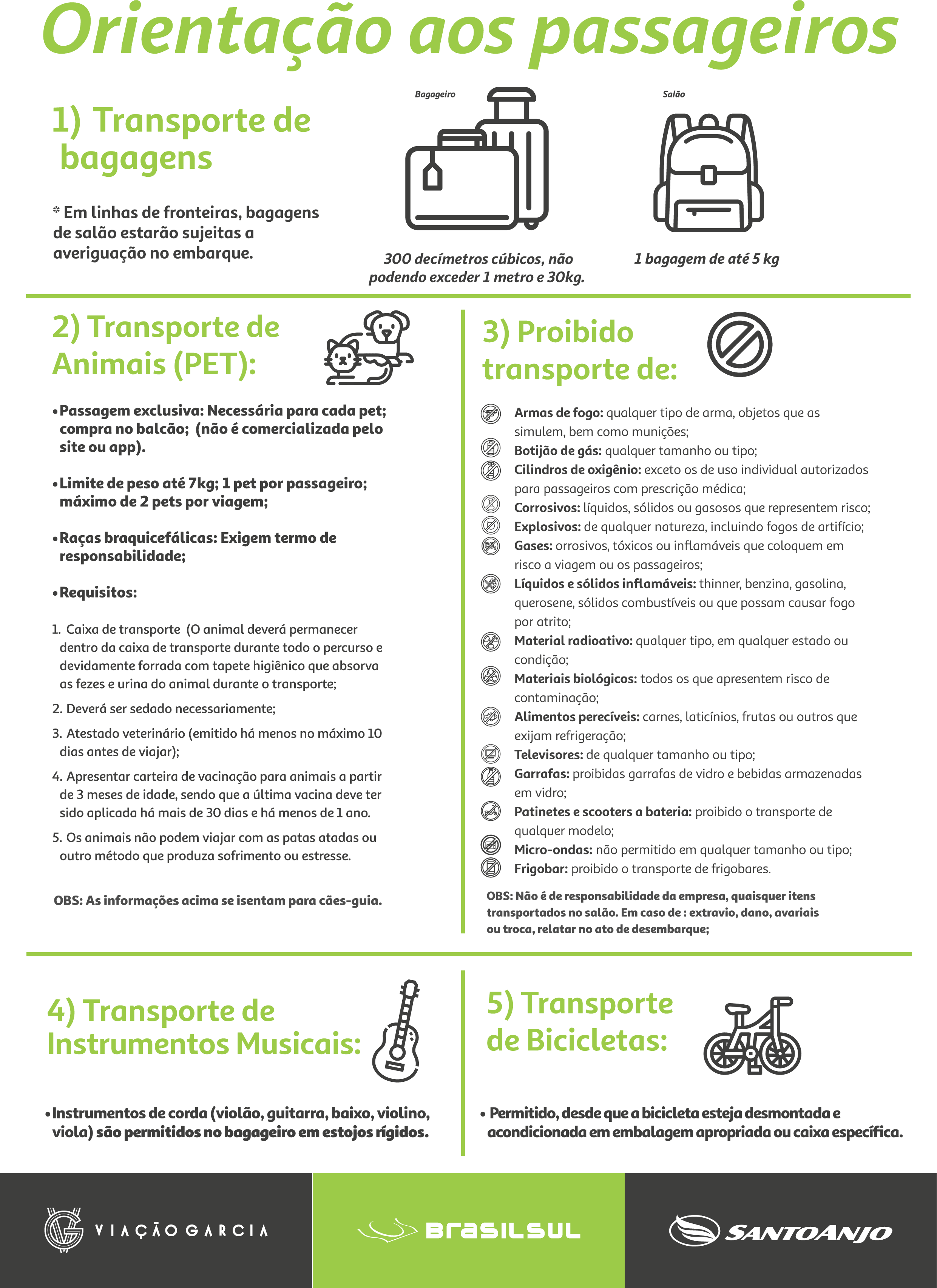 O transporte do pet requer a aquisição de uma passagem exclusiva para o mesmo, sendo que a compra deverá ser feita diretamente no balcão (não é comercializada pelo site ou app). Só transportamos animais de pequeno porte, com até 7 Kg. A Viação Garcia só permite o embarque de apenas 01 (um) animal por passageiro, e até 02 (dois) animais por horário. Por segurança dos gatos e cachorros, algumas raças (braquicefálico) só podem viajar mediante termo de responsabilidade, assinado pelo dono do animal, assumindo os riscos que ameacem o animal durante a viagem. As raças caninas são: Buldogue Americano (American Bully), Boston Terrier, Boxer, Griffon de Bruxelas, Pug Chinês, Chow Chow, Pug Holandês, Pug, Pequinês, Buldogue Inglês, Cavalier King Charles Spaniel, Buldogue Francês, Dogue de Bordeaux, Lhasa Apso, Shih tzu e Shar Pei. Já as raças felinas são: Burmês, Himalaio, Persa e Exotic Shorthair. O animal deverá ser transportado no interior do ônibus, dentro de caixa de transporte própria para viagem, utilizando uma poltrona ao lado do dono, portanto, deverá ser cobrada a tarifa integral da mesma. O animal deverá permanecer dentro da caixa de transporte durante todo o percurso. A caixa deve estar devidamente forrada com tapete higiênico que absorva as fezes e urina do animal durante o transporte. Deverá ser sedado necessariamente. O dono do animal deverá apresentar atestado do médico veterinário que confirme a sanidade do animal e que o mesmo poderá ser transportado sem risco. O atestado deverá ter sido emitido há no máximo 10 dias antes de viajar. Caso a viagem ultrapasse esse tempo, será necessário providenciar outro atestado no local de destino. Apresentar carteira de vacinação para animais a partir de 3 meses de idade, sendo que a última vacina deve ter sido aplicada há mais de 30 dias e há menos de 1 ano. Os animais não podem viajar com as patas atadas ou outro método que produza sofrimento ou estresse.